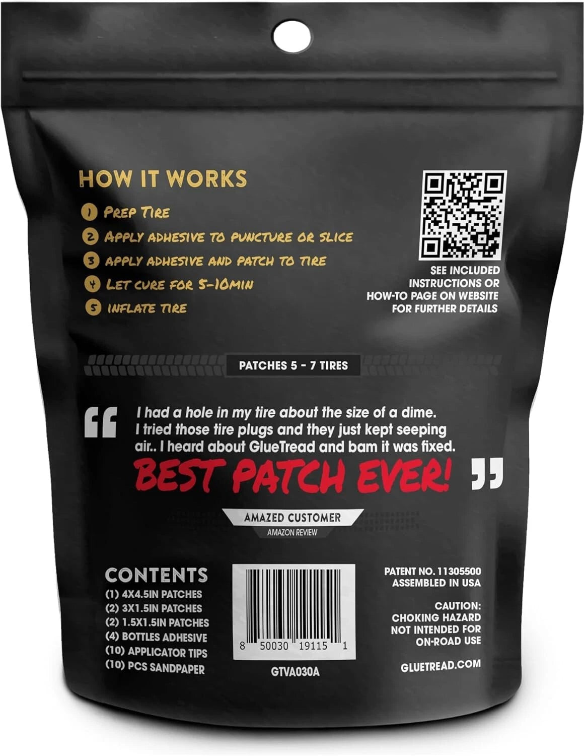 - ENOUGH MATERIAL TO PATCH 5-7 TIRES - The GlueTread sidewall repair kit includes [1] 4" x 4.5", [2] 3” x 1.5” and [2] 1.5"x1.5" patches, catering to various types of damage on off-road tires for comprehensive sidewall tire repair solutions.